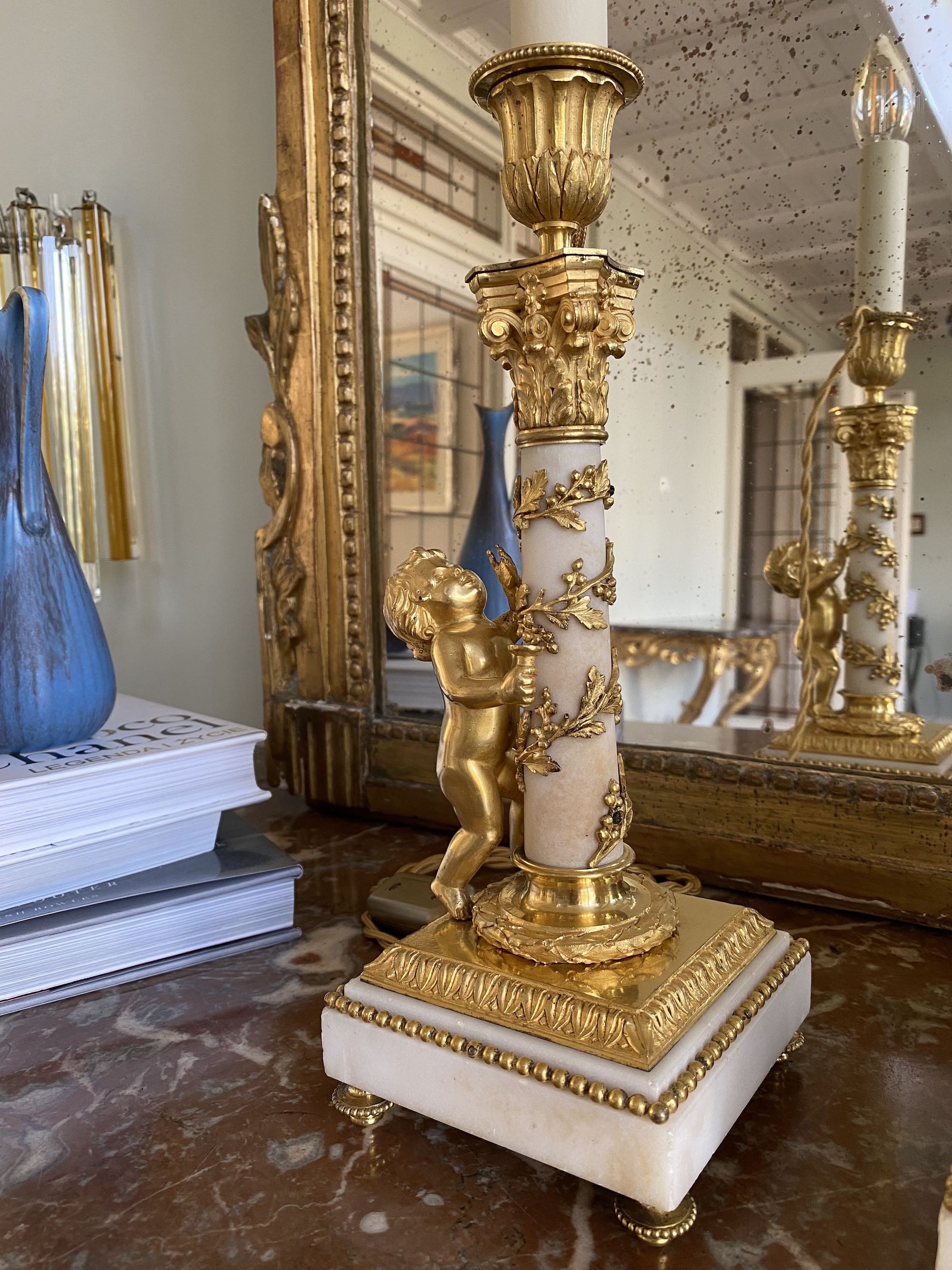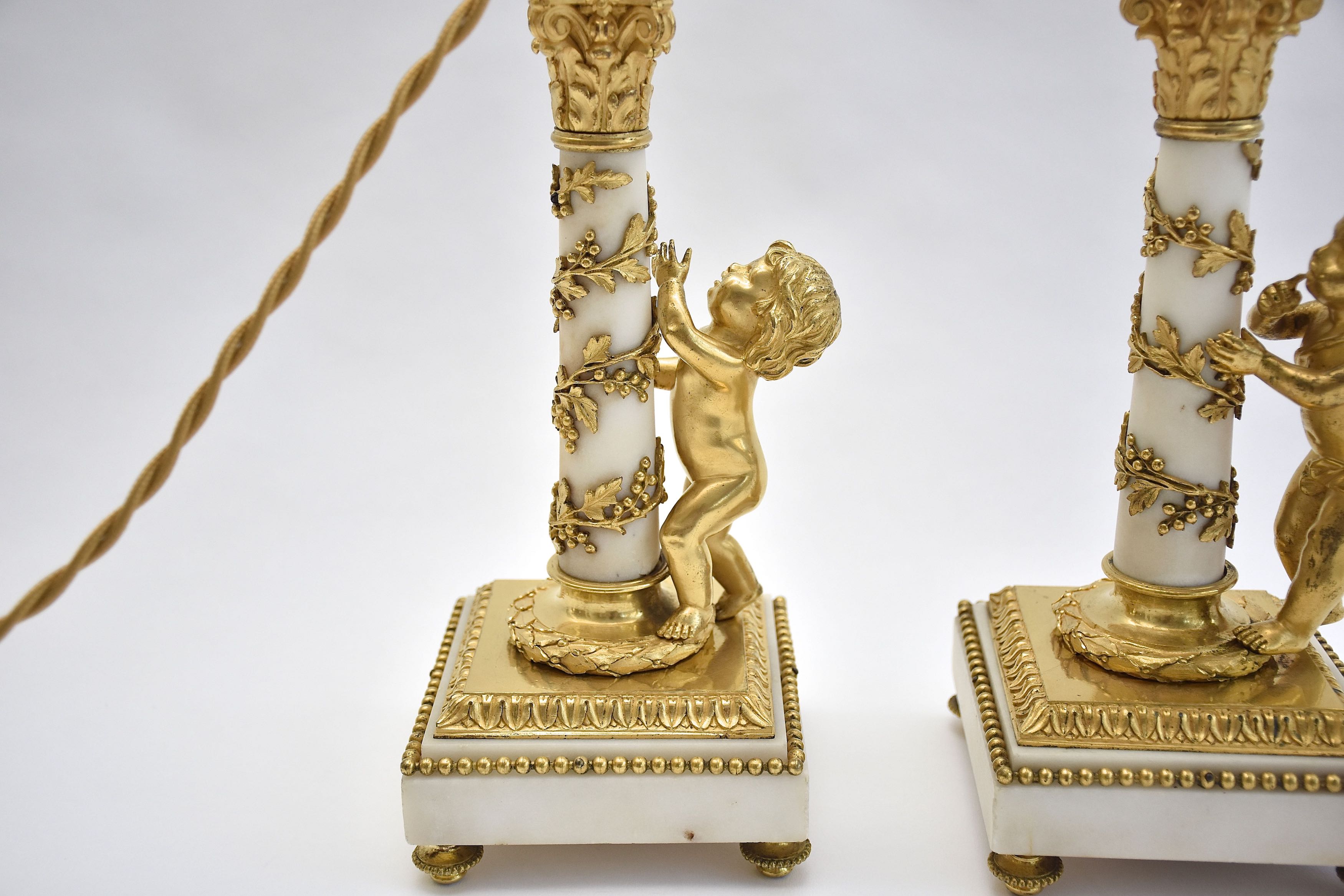 A beautiful pair of Louis XVI style candlesticks representing 'Doric Column' in carved white marble with gilded and chased bronze foliate motifs and putti decor.
